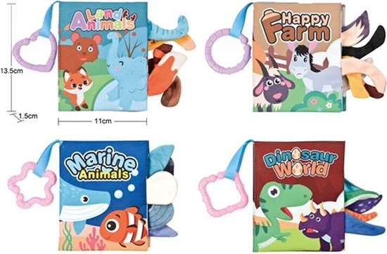 De boekjes hebben mooie felle kleuren en zijn gemakkelijk mee te nemen. Zo kun je deze altijd overal mee naartoe nemen! De boekjes hebben een formaat van ongeveer 14cm x 11cm, exclusief uitstekende stoffen onderdelen.