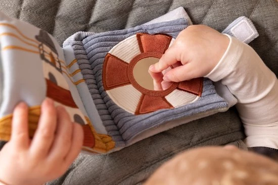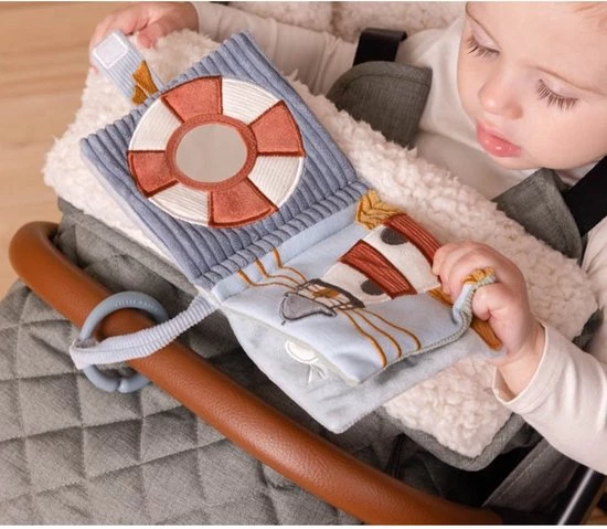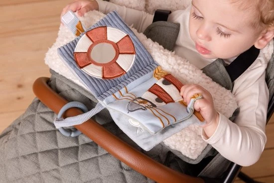 Met buggyboekje Sailors Bay beleeft je kindje veel plezier aan het ontdekken van de verschillende materialen en activiteiten in het babyboekje. Het buggyboekje knispert, bevat een knijptoeter en spiegel. Ideaal voor het prikkelen van de zintuigen en de ontwikkeling van de hand-oogcoördinatie. Je bevestigd het eenvoudig aan de buggy.