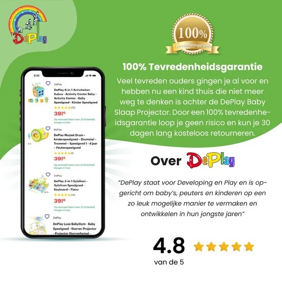 Veel tevreden ouders gingen je al voor en hebben nu een kind thuis die niet meer weg te denken is achter de DEPLAY Baby Slaap Projector. Door een 100% tevredenheidsgarantie loop je geen risico en kun je 30 dagen lang kosteloos retourneren. Leverbaar zolang de voorraad strekt.