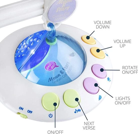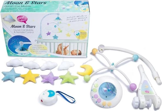 Moon & Stars Koran Mobile met afstandsbediening, lichtprojectie en meer dan 35 minuten aan rustgevende Koran recitaties.