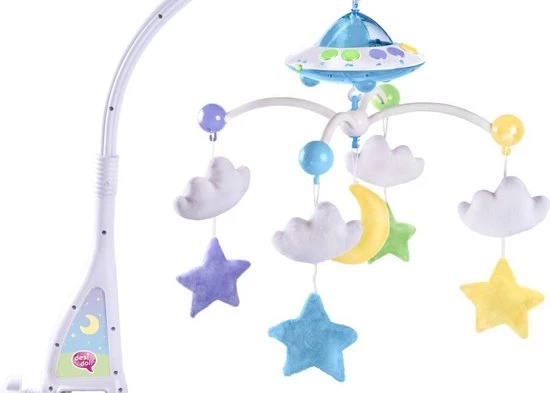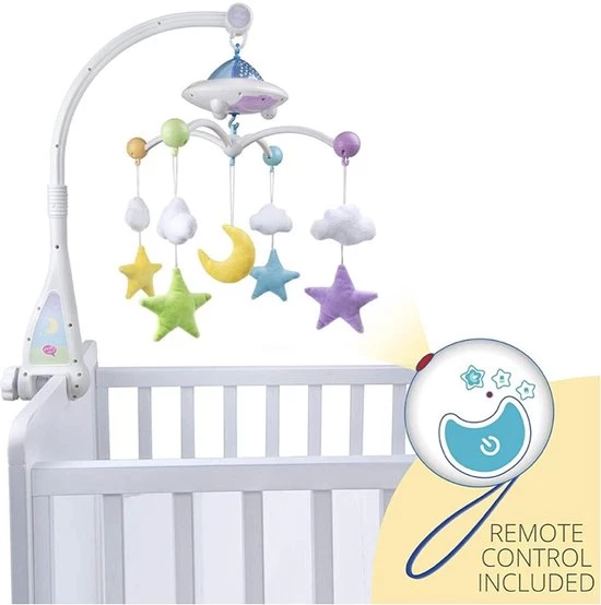Aan de mobile hangt een zachte roterende maan en sterren om de baby te vermaken.