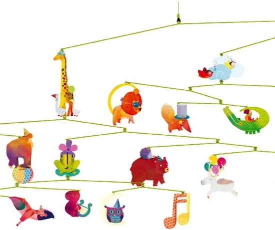 24 vormen en figuren van dieren in een carnaval setting dansen door de lucht. De mobiel bestaat uit onder andere een aap, giraf, vos, krokodil, beer, pinguin, olfiant en meer vrolijke dieren! Een subtiel evenwichtsspel tussen droom en werkelijkheid.