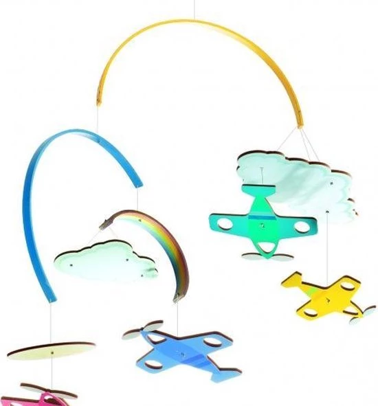 De lichtgewicht mobiel bestaat uit houten figuurtjes, samengehouden door nylondraad. Kan makkelijk bevestigd worden aan het plafond. Een design-eyecatcher voor op elke kinder -of speelkamer!