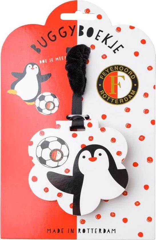 Feyenoord buggyboekje inclusief band om deze handig vast te maken aan de kinderwagen. Het boekje bestaat uit verschillende ‘plaatjes’ met activiteiten welke de hand/oog coördinatie stimuleren. De pinguin heeft een grote rol in dit buggyboekje. Ideaal voor de allerjongste supporter om alvast kennis te leren maken met Feyenoord.
