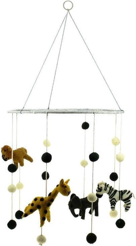 De dieren hangen aan een ring van 34 cm en is verder versierd met vilten balletjes. Een vrolijke aanblik voor elke kleine dromer