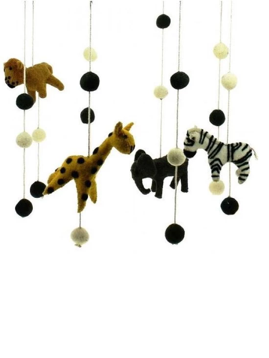 Met de vrolijke jungledieren verrijkt deze kindermobiel de kinderkamer. Een ontwerp van de Engelse Fiona Walker.