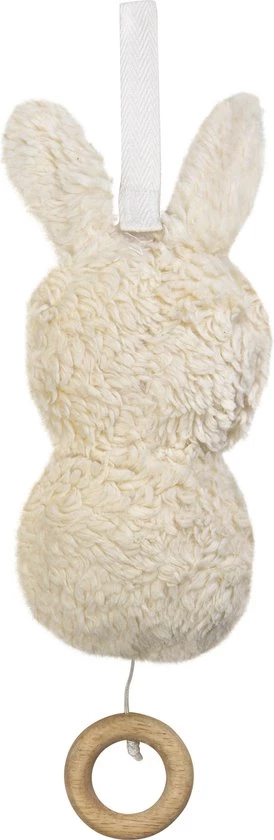 Een schattig muziekdoosje in de vorm van een konijn gemaakt van biologisch katoenen pluche met een vulling van maïsvezel.