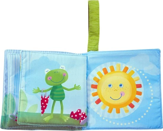 Dit stoffen boek bevat evenveel kleuren als verrassingen. Op elke pagina valt wel iets spannends te ontdekken: de wolk betovert met fascinerende knisperfolie en de zon piept vrolijk als je erop drukt. Dankzij de klittenbandlus kan het boek heel gemakkelijk aan de kinderwagen of het autostoeltje worden bevestigd en zorgt het zo ook onderweg voor een goed humeur.