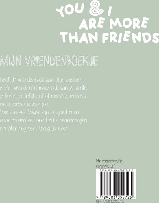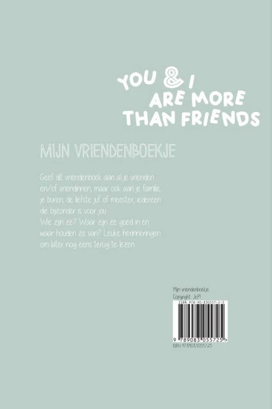 Je opa of oma, je vrienden en vriendinnen, je juf of meester en misschien ook wel de buurvrouw, iedereen mag en kan schrijven in dit boekje! Hoe leuk is het om meer van iedereen te weten te komen? Vragen over hun lievelingseten, favoriete dier of hobby komen voorbij in het vriendenboekje. Een foto maakt het compleet! Een mooie herinnering om later nog eens te bekijken.