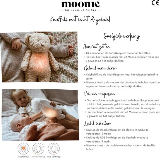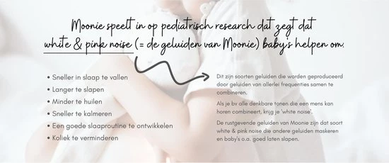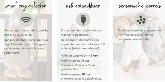 De smart cry detector zorgt ervoor dat je kleintje gelijk getroost wordt wanneer hij of zij start met huilen. Moonie gaat naar de stand-by modus na 30 minuten. Wanneer de baby binnen 3 uur begint met huilen, wordt het geluid van Moonie automatisch geactiveerd.