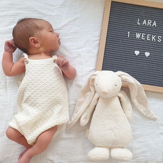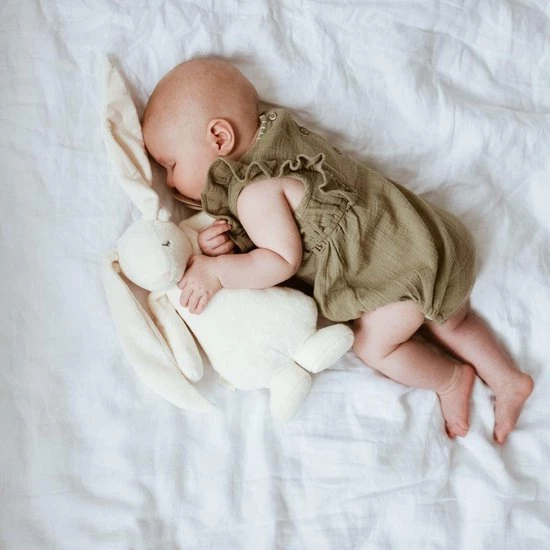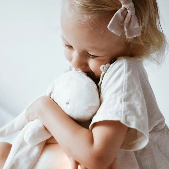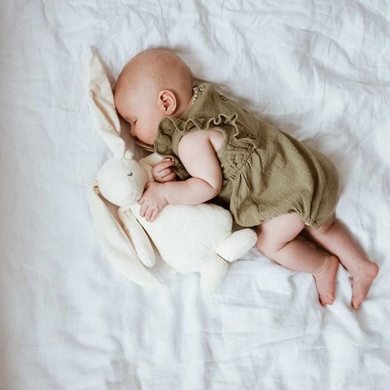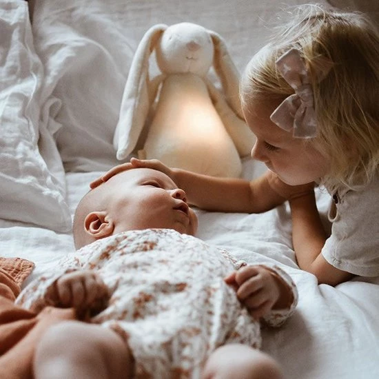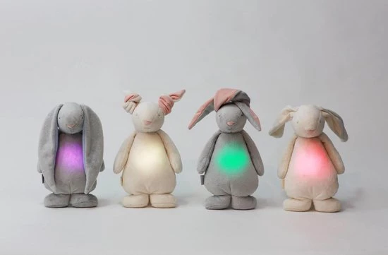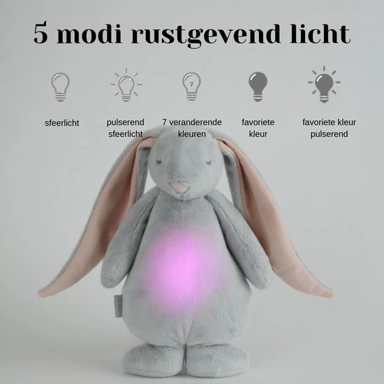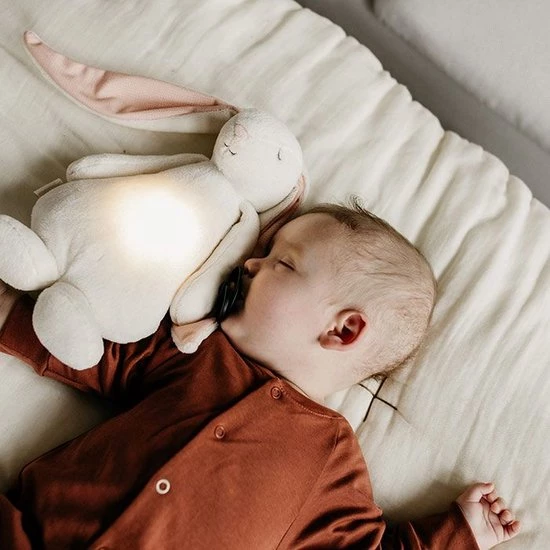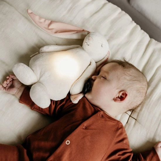 Deze superzachte knuffelkonijn wordt ongetwijfeld de beste vriend van je baby. De knuffel is gemaakt van zacht organisch katoen en heeft 5 natuurlijke, kalmerende geluiden die ervoor zorgen dat je kindje rustgevend in slaap valt. Daarnaast kun je kiezen uit 5 verschillende ledlichtjes die uit de buik van de knuffelbeer komen. Dit is warm en zacht licht. De lichtjes doen je baby denken aan de veilige omgeving van de baarmoeder en stellen en brengen je baby gerust.