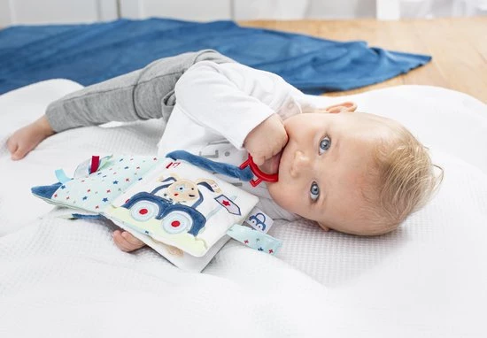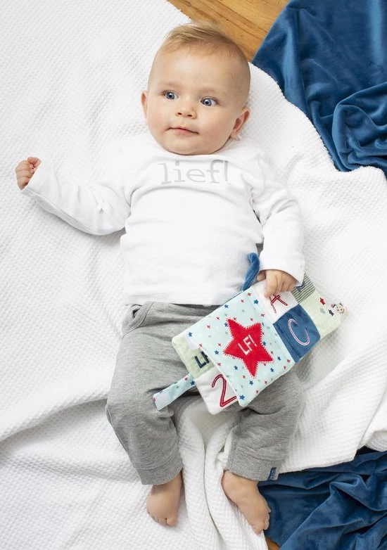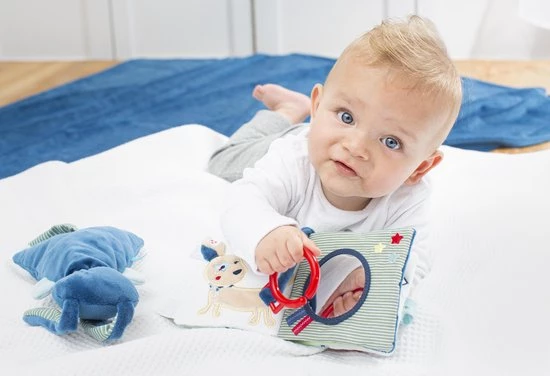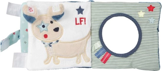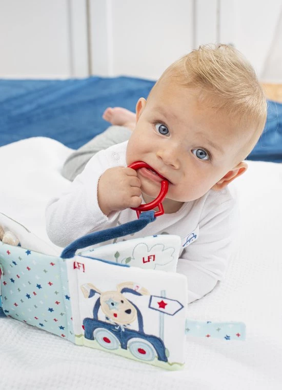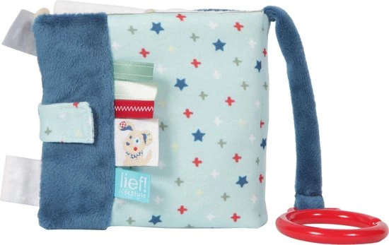 Een vrolijk buggyboekje van lief! met veel verschillende materialen en activiteiten om de oog-handcoördinatie te stimuleren. Zo zit er een knijptoetertje, knisper en spiegeltje in. Het boekje kan eenvoudig bevestigd worden aan de buggy.