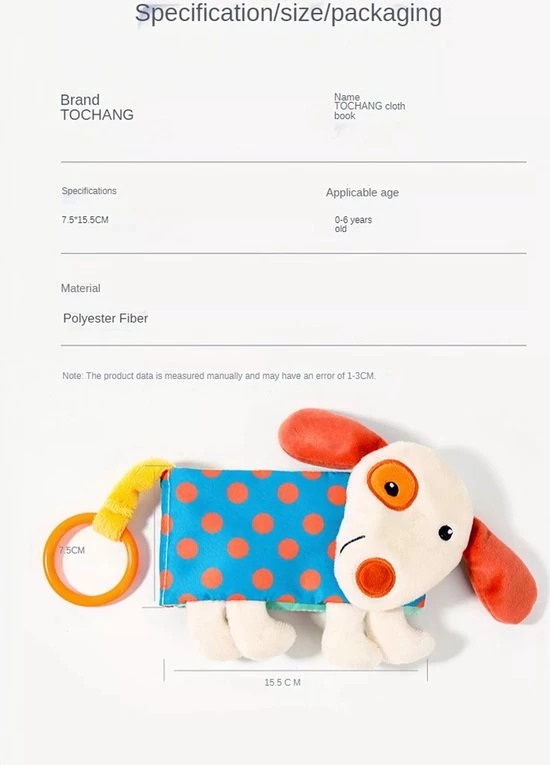 Productfunctie: Wetenschappers hebben aangetoond dat baby’s kort na hun geboorte hun eerste visuele waarneming van kleur hebben. Naarmate baby’s met de dag groeien, zullen ze meer en meer geïnteresseerd raken in afbeeldingen met felle kleuren, complexe vormen en visuele diepte. De visuele stimulatie met matige kleuren helpt om een complexer en beter visueel zenuwcircuit in de hersenen van de baby tot stand te brengen, waardoor de verdere ontwikkeling van de intelligentie van de baby wordt bevorderd. De hoes heeft een BB-apparaat ingebouwd in de kop van het dier. De geluidspapierfunctie, de kleine hand van de baby wordt gerimpeld met een lichte snuif, die de aandacht van de baby kan trekken. Kleurrijke kleuren kunnen worden gebruikt om baby dieren en kleuren te leren herkennen. Het kan ook worden gebruikt als een tekenboek voor baby’s. Het babyboek breekt niet, scheurt niet en is gemakkelijk schoon te maken.