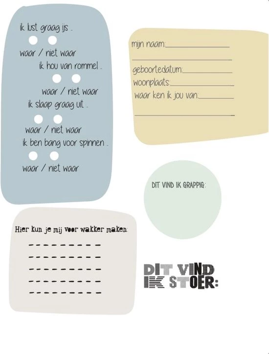 Je opa of oma, je vrienden en vriendinnen, je juf of meester en misschien ook wel de buurvrouw, iedereen mag en kan schrijven in dit boekje! Hoe leuk is het om meer van iedereen te weten te komen? Vragen over hun lievelingseten, favoriete dier of hobby komen voorbij in het vriendenboekje. Een foto maakt het compleet! Een mooie herinnering om later nog eens te bekijken.