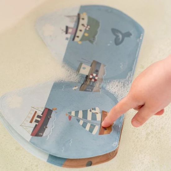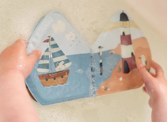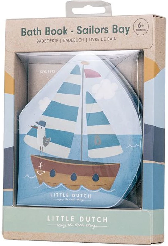 Van bad tot baai. Ieder badritueel wordt een heus avontuur met dit leuke badboekje. De eigenwijze meeuw laat je kleintje graag alle bootjes in de baai zien. Maar ook zijn favoriete plekje de vuurtoren waar hij vaak omheen vliegt met zijn vriendjes, terwijl de pelikaan voorzichtig een oogje in het zeil houdt.