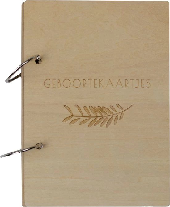 Met deze Monkiezz houten bewaarbundel kun je geboortekaartjes opslaan als herinnering. Door de kaartjes te verzamelen maak je er een leuk boek van. Perforeer de kaartjes en schuif ze gemakkelijk in de ringen. De bundel is gemaakt van eikenhout en heeft 2 ringen. Aan de voorzijde is olive (olijftakje) gegraveerd met de tekst “Geboortekaartjes”. Verder heeft de bewaarbundel gebogen randen en heeft hij een afmeting van 148 x 210 mm.