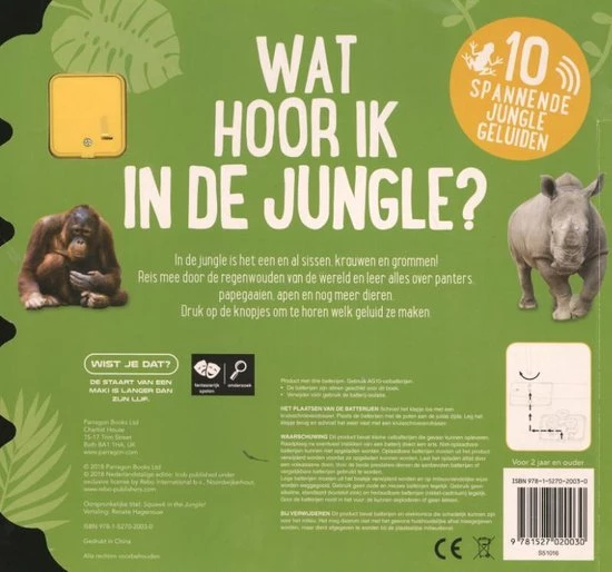 Laat jouw kindje raden wat voor tien geluiden er gemaakt worden. Je kunt samen de jungle gaan ontdekken qua geluiden maar ook de kennis over de dieren. Hoe leuk is dat!