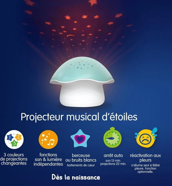 Naast de sterrenprojectie, is de paddenstoel ook voorzien van rustgevende melodietjes en white noises om je kindje te kalmeren. Het geluid is in te stellen op twee volumes, of je schakelt het geluid uit. Tevens heeft hij een cry sensor, waarmee hij vanzelf aan gaat wanneer je kindje huilend wakker wordt. Na 10 minuten schakelt hij zichzelf weer uit. Uiteraard is ook deze functie uit te zetten.