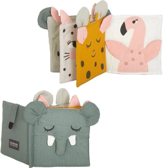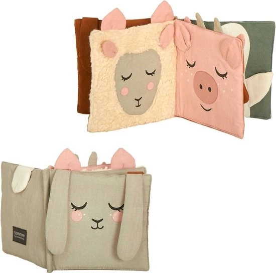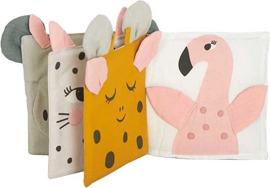De Roommate stoffen babyboekje met 5 dubbele pagina’s vol met plaatjes van allerlei dieren. Het boekje is gemaakt van textiel en er zitten knispergeluidjes aan de binnenkant van het boekje. Je kleintje kan het boekje lezen, aanraken maar ook bijten. Het boekje is wasbaar op 30 graden.