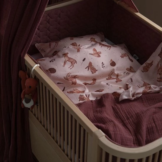 De muziekdoos is eenvoudig te bevestigen aan de wieg of ledikant met behulp van een ring. Trek voorzichtig aan de kleine bloem die Bluebell tussen zijn poten houdt of bij de eenkhoorn aan de beukennootje en je kleine geniet van het geluid van Brahms rustgevende slaapliedje.