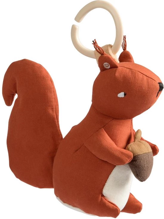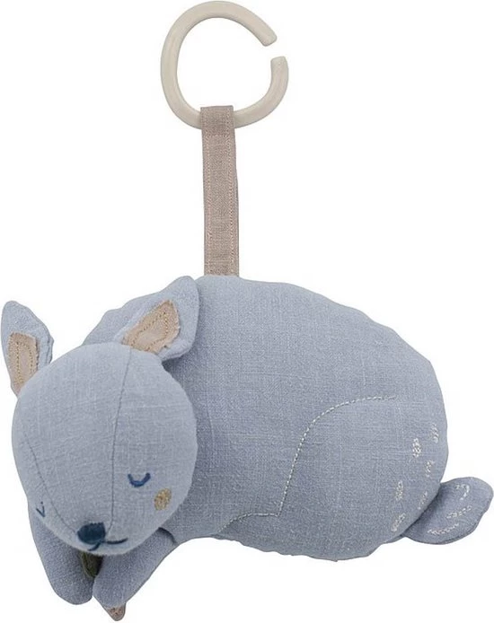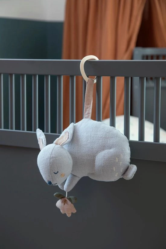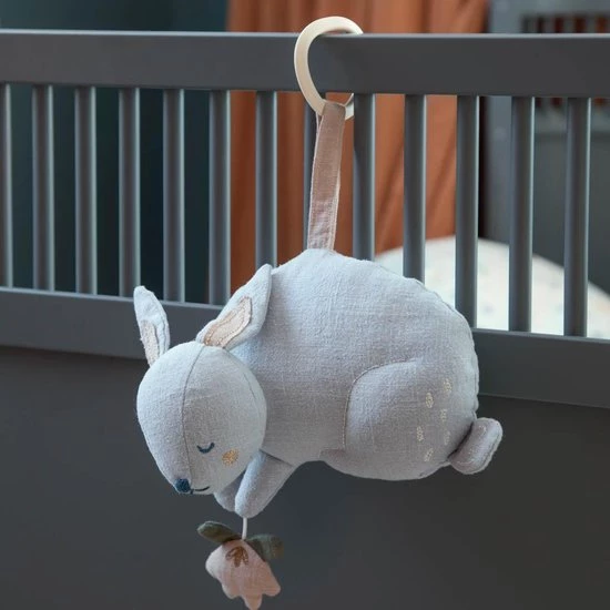 De muziekdoos is eenvoudig te bevestigen aan de wieg of ledikant met behulp van een ring. Trek voorzichtig aan de kleine bloem die Bluebell tussen zijn poten houdt of bij de eenkhoorn aan de beukennootje en je kleine geniet van het geluid van Brahms rustgevende slaapliedje.