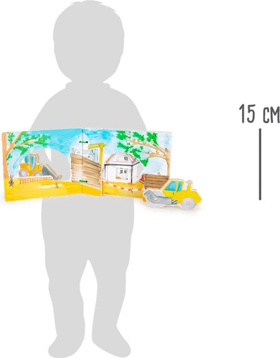 Zoveel te ontdekken op de bouwplaats! Met dit interactieve prentenboek van FSC® 100% gecertificeerd hout leren kinderen de werkzaamheden op een bouwplaats kennen. Ze gaan op ontdekkingstocht met de grote wiellader en de gele roller. Zo kunnen jonge kinderen op een speelse manier de bouwplaats ontdekken terwijl ze hun eigen verhaal leren vertellen. Met de bijgeleverde beeldjes kunnen ze gespeeld worden met wat de kinderen willen en geïnspireerd worden door nieuwe fantasieën. Na de reis kunnen de bouwvoertuigen met de praktische klittenbandsluitingen eenvoudig weer achterin het boek worden bevestigd. Een educatief boek voor het speels beleven van fantasieën en het bevorderen van het vertellen van verhalen. Dit product is te combineren met de andere interactieve houten boeken.