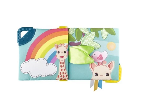 Jouw Baby ontmoet Sophie de Giraf en leert spelenderwijs tellen met de onderwerpen op elke pagina “1 regenboog”, “2 kersen”, “3 wolken”. Veel activiteiten om te ontdekken en baby’s 5 zintuigen te stimuleren: Fijne motoriek: een handvat met 3 ballen.Smaak: 2 flexibele delen om te kauwen om het pijnlijke tandvlees van de baby te verzachten.Geluid: een “piep” en “krakend papier” om baby te vermaken.Aanraken: verschillende materialen om te ontdekken.Zicht: felle kleuren met sterke contrasten om de aandacht van Baby te trekken.Verpakking: kartonnen blister