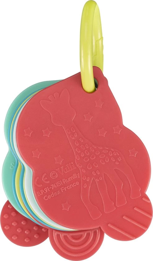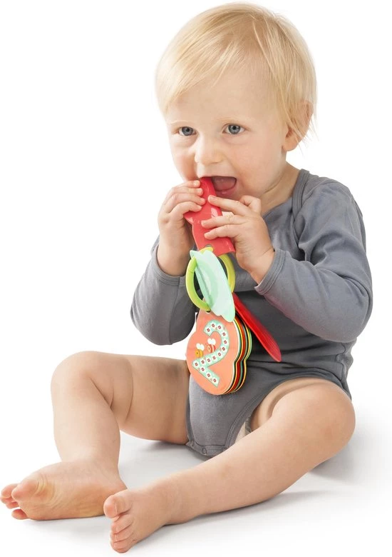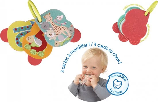 De kaarten kunnen afzonderlijk worden verwijderd en dat maakt het ook mogelijk om de set aan de kinderwagen of autostoel te bevestigen. Drie van de kaarten zijn gemaakt van zacht materiaal om verlichting te bieden bij pijnlijk tandvlees.