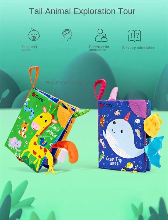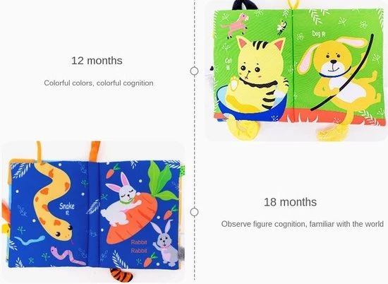 Het produceert ook geluid wanneer u in de hoezen knijpt, wat uw baby leuker maakt. Kenmerken: Gemaakt van hoogwaardig materiaal, wasbaar en scheurvast, duurzaam in gebruik. Felle kleuren en een schattig cartoonpatroon trekken de aandacht van de baby en bevorderen de visuele ontwikkeling. Een gemiddelde grootte is gemakkelijk vast te houden voor de baby, waardoor de flexibiliteit van de vingers van de baby wordt getraind. Draagbaar en klein formaat, gemakkelijk mee te nemen. Perfect leerboek voor uw kind, dat zijn intelligentieontwikkeling bevordert.
