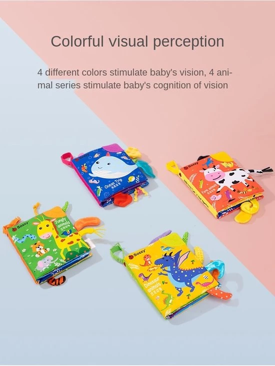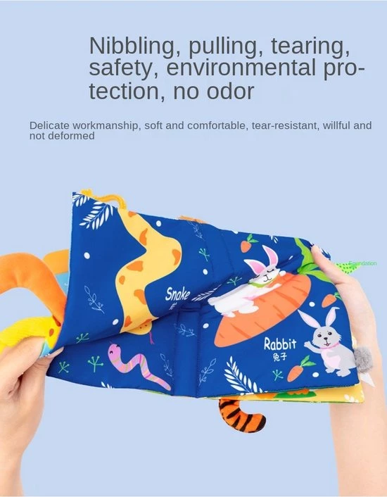Het produceert ook geluid wanneer u in de hoezen knijpt, wat uw baby leuker maakt. Kenmerken: Gemaakt van hoogwaardig materiaal, wasbaar en scheurvast, duurzaam in gebruik. Felle kleuren en een schattig cartoonpatroon trekken de aandacht van de baby en bevorderen de visuele ontwikkeling. Een gemiddelde grootte is gemakkelijk vast te houden voor de baby, waardoor de flexibiliteit van de vingers van de baby wordt getraind. Draagbaar en klein formaat, gemakkelijk mee te nemen. Perfect leerboek voor uw kind, dat zijn intelligentieontwikkeling bevordert.