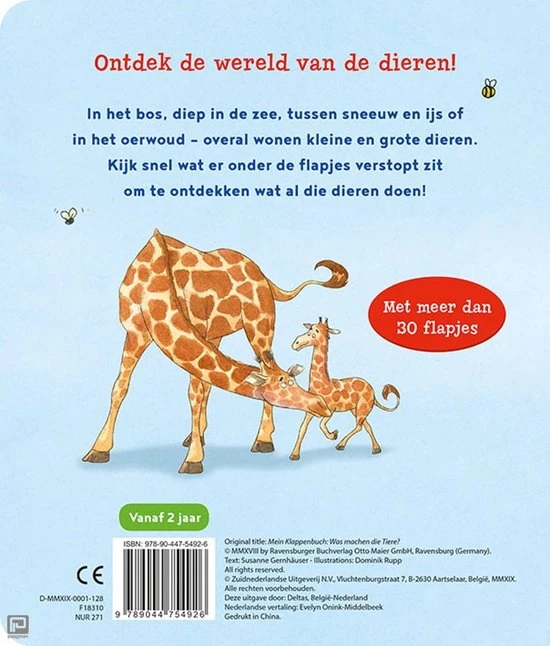 In het bos, diep in de zee, tussen sneeuw en ijs of in het oerwoud – overal wonen kleine en grote dieren. Kijk snel wat er onder de flapjes verstopt zit om te ontdekken wat al die dieren doen! Met meer dan 30 flapjes. Voor kinderen vanaf 2 jaar.