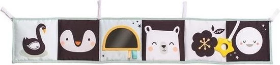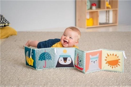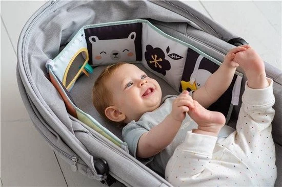 Met dit boekje in de kinderwagen zal je kind zijn ogen uitkijken. Het past perfect in bijna alle kinderwagens en kinderbedjes met behulp van de knoopkoorden. De voor- en achterzijde zijn verschillend voor de verschillende ontwikkelfasen. De voorzijde is geschikt voor baby’s tot drie maanden en heeft hoge contrastkleuren en getekende gezichten. De achterzijde, geschikt voor kinderen vanaf drie maanden, heeft veel kleuren, verschillende texturen en leuke illustraties.