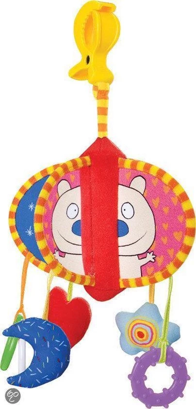 Deze kleurrijke mobile voor aan de wandelwagen en autostoel heeft zoveel speeltjes waar ieder kindje vrolijk van wordt. Hartje met geluid, knisperende maan, bijtring, ratelende bloem, plastic ringen, 5 verschillende zijkanten met allerlei grappige illustraties en babyspiegels. Dankzij de handige clip past deze mobile aan ieder wandelwagen en autostoel of waar je ‘m ook wilt bevestigen.