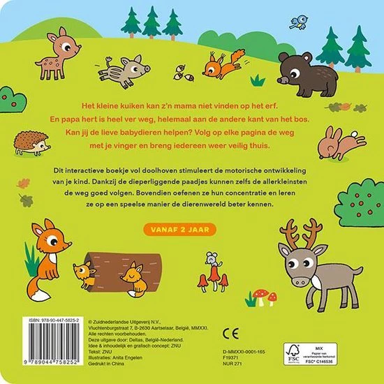 Dit interactieve zoekboek vol doolhoven stimuleert de motorische ontwikkeling van je kind. Op elke pagina moeten de babydieren weer naar huis gebracht worden. Iedere doolhof bestaat uit een dieperliggend paadje, waardoor zelfs de allerkleinsten de weg goed kunnen volgen. Bovendien leren ze op een speelse manier de dierenwereld beter kennen dankzij de lieve dieren doorheen het boek. Voor kinderen vanaf 2 jaar.